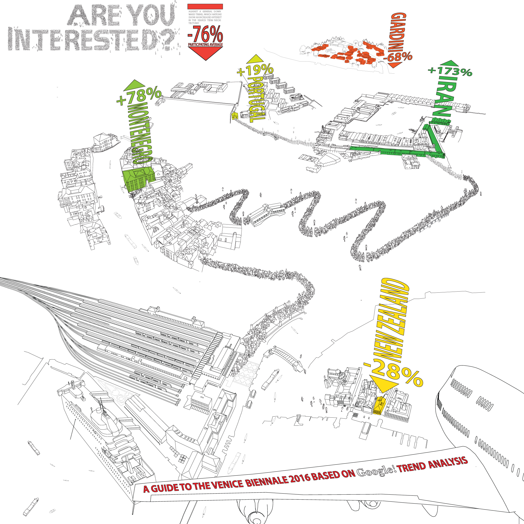 برت استیل، در صفحه ۳۰ کتاب «چهار گفتگو درباره معماری گفتمان»(نشر انجمن معماری، لندن، ۲۰۱۲) میگوید: «معماری یک مشکل عمیق ریشهای و اساسی در رابطه با ایده مخاطب پذیری دارد.» اگر به جستجوهای اینترنتی استناد کنیم، مخاطبان جهانی معماری در حال کاهش هستند. نقشه «آیا شما علاقهمند هستید؟» از دادههای گوگل ترند و تعداد کل جستجوهای واژه «معماری» از سال ۲۰۰۴ تا سال ۲۰۱۶ استفاده کرده و نتیجه آن را در این نقشه به زبانهای مختلف کشورهای شرکتکننده در دوسالانه ارائه کرده است. این نقشه کاهش کلی ۷۶ درصدی در این دوره و افزایش حیرتآور میزان علاقهمندی در چند کشور دیگر را نشان میدهد. درحالیکه تعداد زیادی از بازدیدکنندگان در محل دوسالانه جمع میشوند چگونه این رویداد توجه جامعه جهانی را به سمت معماری جلب میکند؟ و ما چطور باید چند کشوری که میزان مخاطبان و علاقهمندان به معماری در آنها افزایش دارد را به جلو برانیم؟