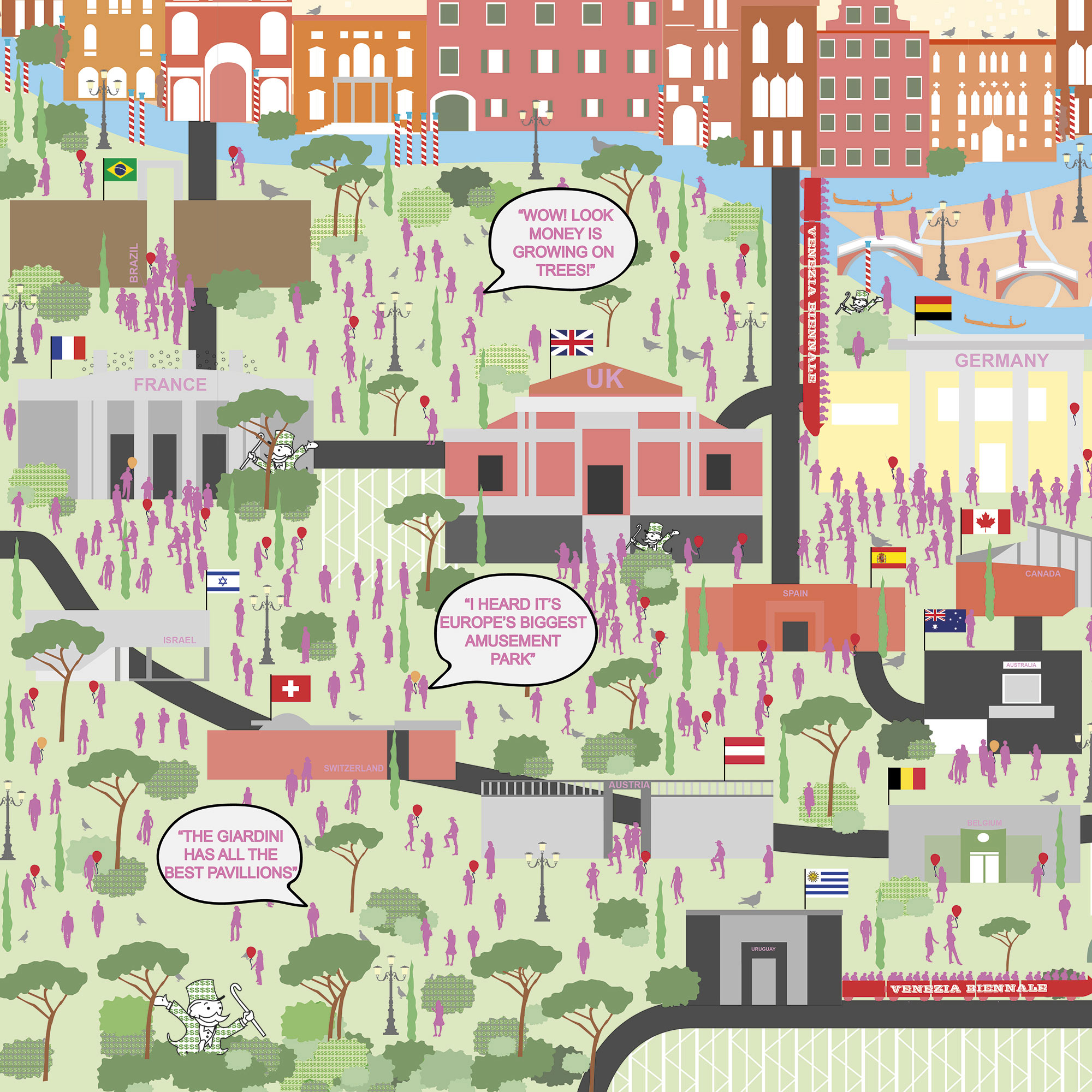 درحالیکه این ناهماهنگی بین دنیای داخل دوسالانه و جهان واقعی پیرامون از اولین دوسالانهای که در سال ۱۹۸۰ افتتاح شد تا به حال کموبیش مورد بحث بوده، اما هرگز بیشتر از این اظهار نشده و مشکلساز نبوده است. چرا باید بهترین غرفههای ملی دوسالانه از لحاظ موقعیت با برنامه قبلی در اختیار کشورهای خاصی قرار بگیرد درحالیکه کشورهای دیگر برای جلبتوجه و دیده شدن تقلا میکنند؟ آیا در دورانی که معماری در سطح جهانی فعال است، تبعیض بین کشورها و مناطق مختلف معقول و منطقی است؟ و اگر ساختمانهای دوسالانه در این محل ثابت باقی بمانند، راهروها و مسیرها هم نباید تغییر کنند؟