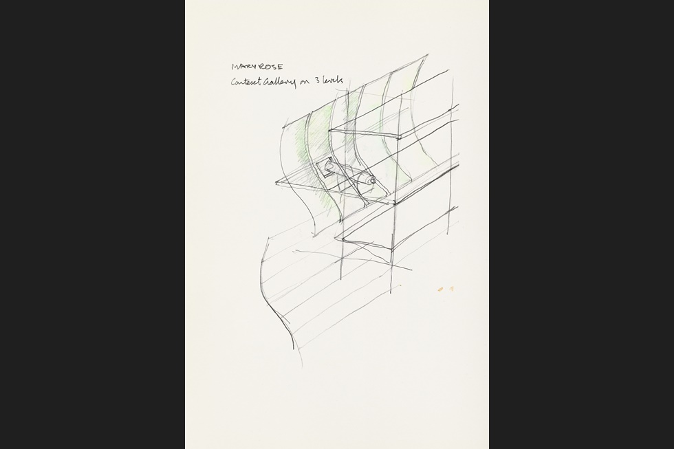 در پروژهای کاملاً متفاوت، اسکیس های اولیه ایدههایی مفهومی را از طرح نشان میدهند که از درون شروعشده و به بیرون ختم میشود؛ کشتی مِری رز در مرکز حوضچهی تعمیراتی قرار میگیرد که در طرح کامل «سالن کشتیها» خواهد شد. این بنا هندسه حلقوی خود را از فرم بدنه کشتی گرفته و بهگونهای طراحیشده که با بافت متمایز پیرامون خود در کنار ناو فرماندهی دریاسالار نلسون و ساختمانهای نیروی دریایی اسکلهی قدیمی پورتسموث تناسب کامل دارد. یک پلان و مقطع اتوکدی دقیق، نقطهی عطف ایده اولیه تا فرم اجرایی، ، روند پیشرفت طرح را به شیوهای واقعبینانه اما هنرمندانه نشان میدهد.