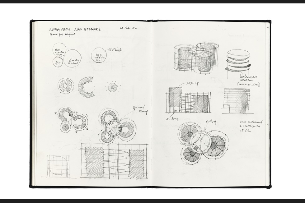 فرآیند طرح را میتوان از همان اسکیس کانسپتهای اولیه در مرحله مسابقه تا توضیحاتی در مورد زمانبندی، روند کلی ترسیمات و جزییات پوششهای فلزی مشاهده نمود. در این پروژهی عظیم ۱۴۵ آپارتمان مجلل درون اسکلت چدنی مرمتشده از دورهی ویکتوریایی ساختهشدهاند. هریک از این مخازن قطری متفاوت داشته و هندسه شعاعی آن، طرح و اجرا را پیچیده میکند. این پروژه که در حال حاضر رو به اتمام است از سال ۲۰۰۲ شروعشده و با موفقیت ایده اصلی طراحی این بنا را دنبال میکند. این موفقیت تا حدودی مدیون اسکیسهای بیشماری است که در حین طراحی در چندین دفتر ترسیمشده و همزمان با بیش از ۱۰۰۰ فایل اتوکد و رویت مورداستفاده قرارگرفتهاند.