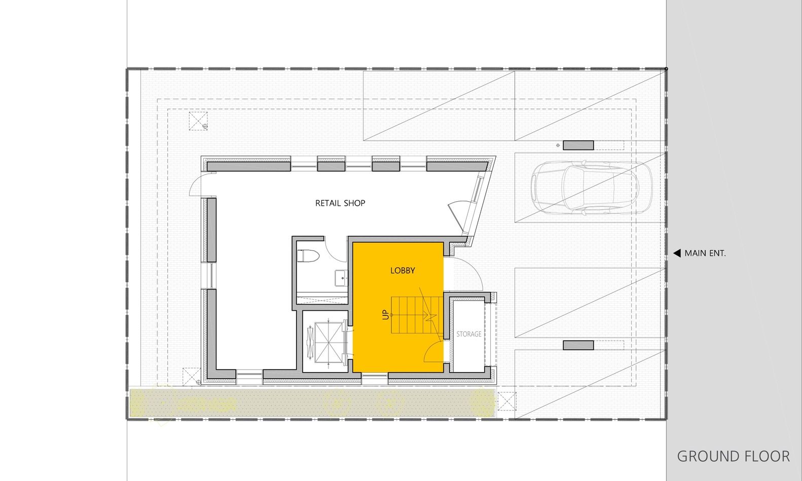 پیلوتیهای ساختمان و فضای فروشگاهی طوری طراحیشدهاند که ارتباط فعالی با فروشگاههای خیابان داشتهباشند و امکان گسترش آنها وجود داشته باشد. ورودی اصلی و فضای داخلی طبقه همکف با رنگهای روشن قرمز و لیموییرنگ آمیزی شدهاند که به افزایش جذابیت ساختمان نسبت به ساختمانهای مجاور کمک میکند.