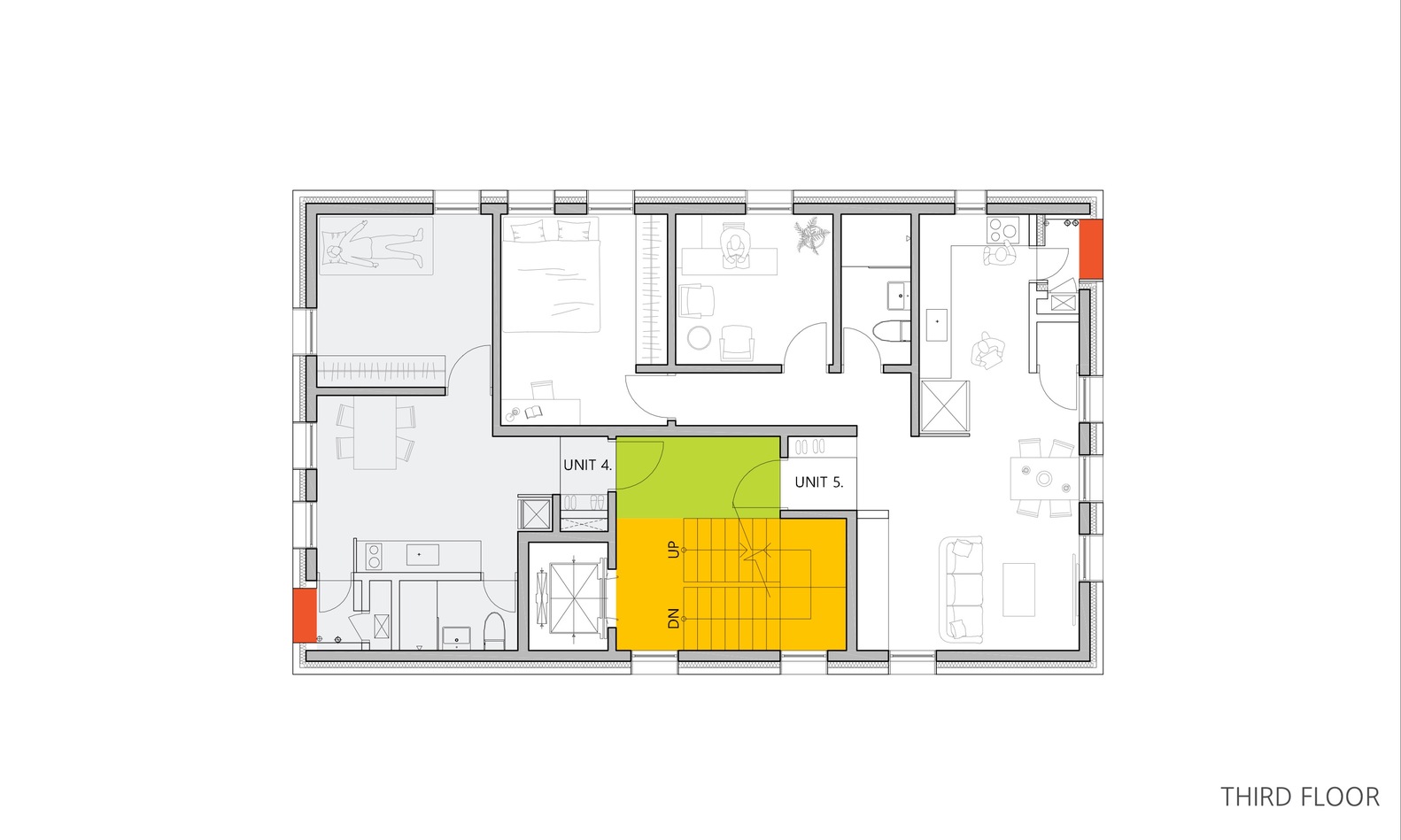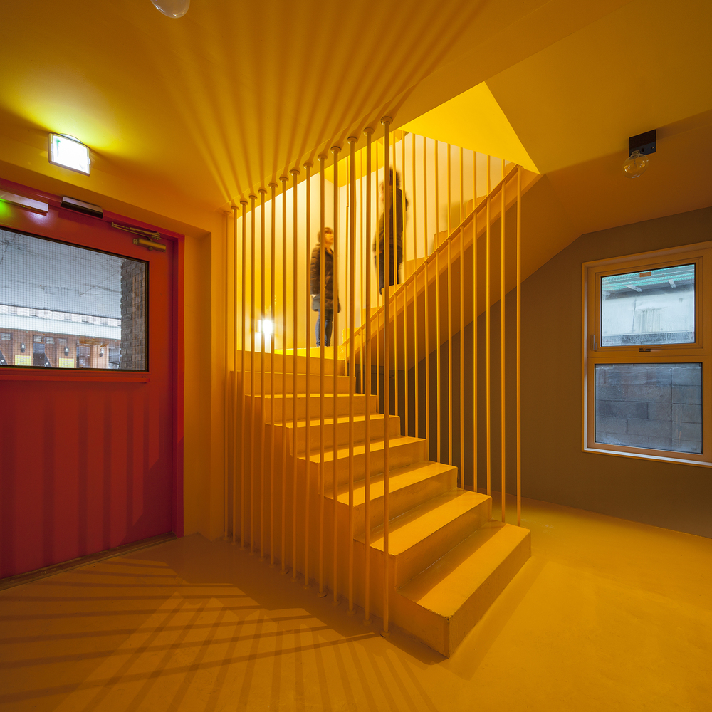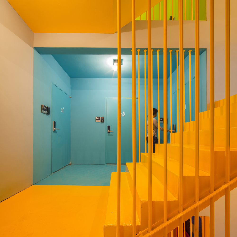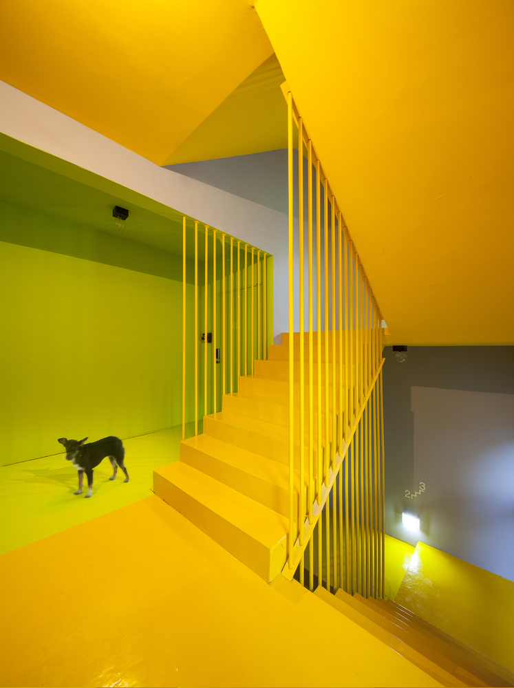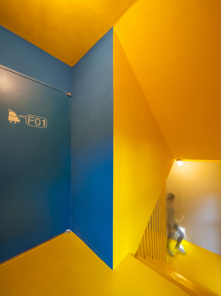 راهروهای زرد به طبقهای با رنگ متضاد میرسند. با این روش نهتنها افراد با توجه به رنگآمیزی میتوانند تشخیص بدهند در کدام طبقه هستند بلکه در فضای عمومی لابی، راهروی ورودی و پلهها با صحنهای غیرعادی و متفاوت مواجه میشوند. این تجربه عجیب باعث میشود فضاهای اصلی غیرمنتظرهتر و جذابتر به نظر برسند.