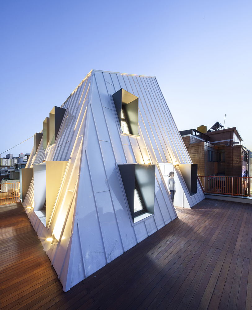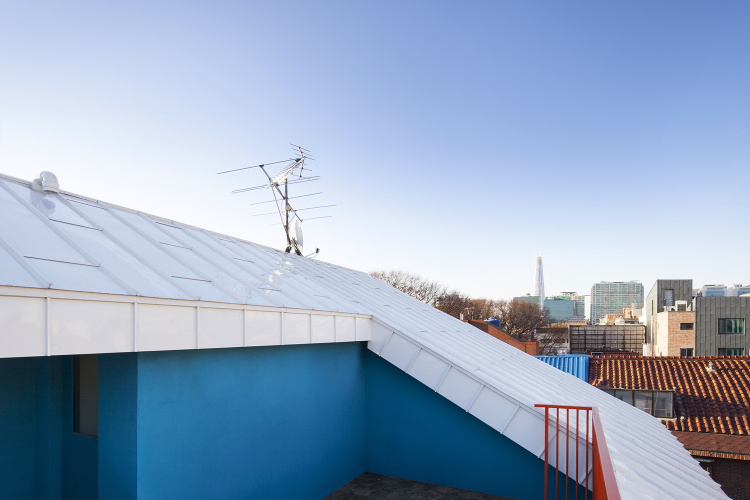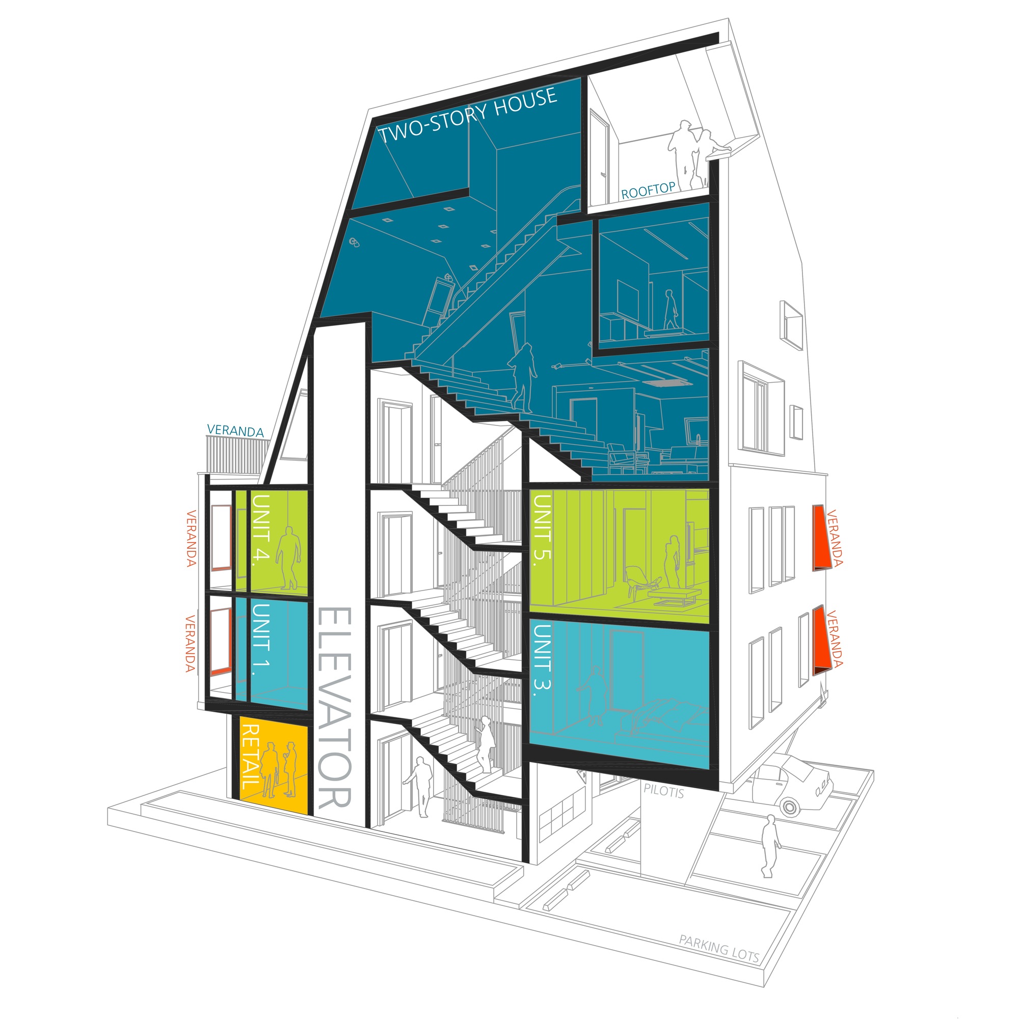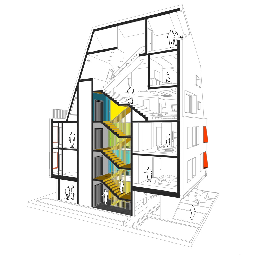 سفارشدهنده این پروژه بسیار تمایل داشت که خانه دوطبقهاش مانند یک پنت هاوس متفاوت بالای خانههای استیجاری قرار بگیرد و متناسب با فعالیتهای گوناگون فضای داخلی و خارجی داشته باشد. معماران استفاده از رنگها، بافتها و مصالح متفاوت در نمای خارجی را پیشنهاد کردند تا به این وسیله فضای استیجاری و تملیکی در نمای خیابان از هم متمایز باشند. علاوه بر این، ترکیب اشکال متنوع- مانند طراحی جعبه آجری کلاسیک و مقرونبهصرفه برای خانههای استیجاری و یک ذوزنقه سفید مدرن برای خانه مجلل- باعث میشود ویژگیهای مدنظر آنها به بهترین شکل نمایان شود.