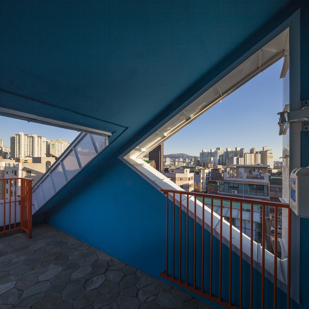 هرکدام از خانههای استیجاری بالکنی مخصوص به خودشان دارند که تنها فضای خارجی هر واحد است. چارچوب قرمز بالکن آن را هم در نمای داخلی و هم در نمای خارجی از بخشهای دیگر ساختمان متمایز میکند. علاوه بر این، قاب استیل پنجرهها باعث شفافیت پنجره و نمای خارجی، تقویت عایق و کارکرد ضد آب آن میشود.