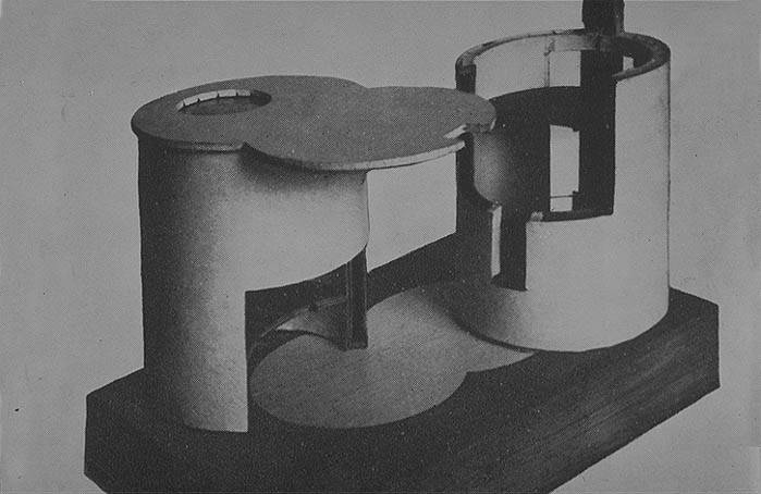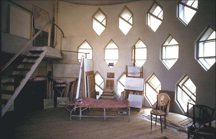 بهرغم ایدۀ «ماشینی برای زندگی»[i] لوکوربوزیه، کنستانتین ملنیکف به «خانه بهمثابۀ معبد»[ii] معتقد بود و بر کنار خیابانی در مرکز شهر مسکو ساختمان عجیبوغریبِ استوانهایشکلی ساخت و بر کتیبۀ نمای ورودی بنا چنین نوشت: «کنستانتین ملنیکف – معمار»