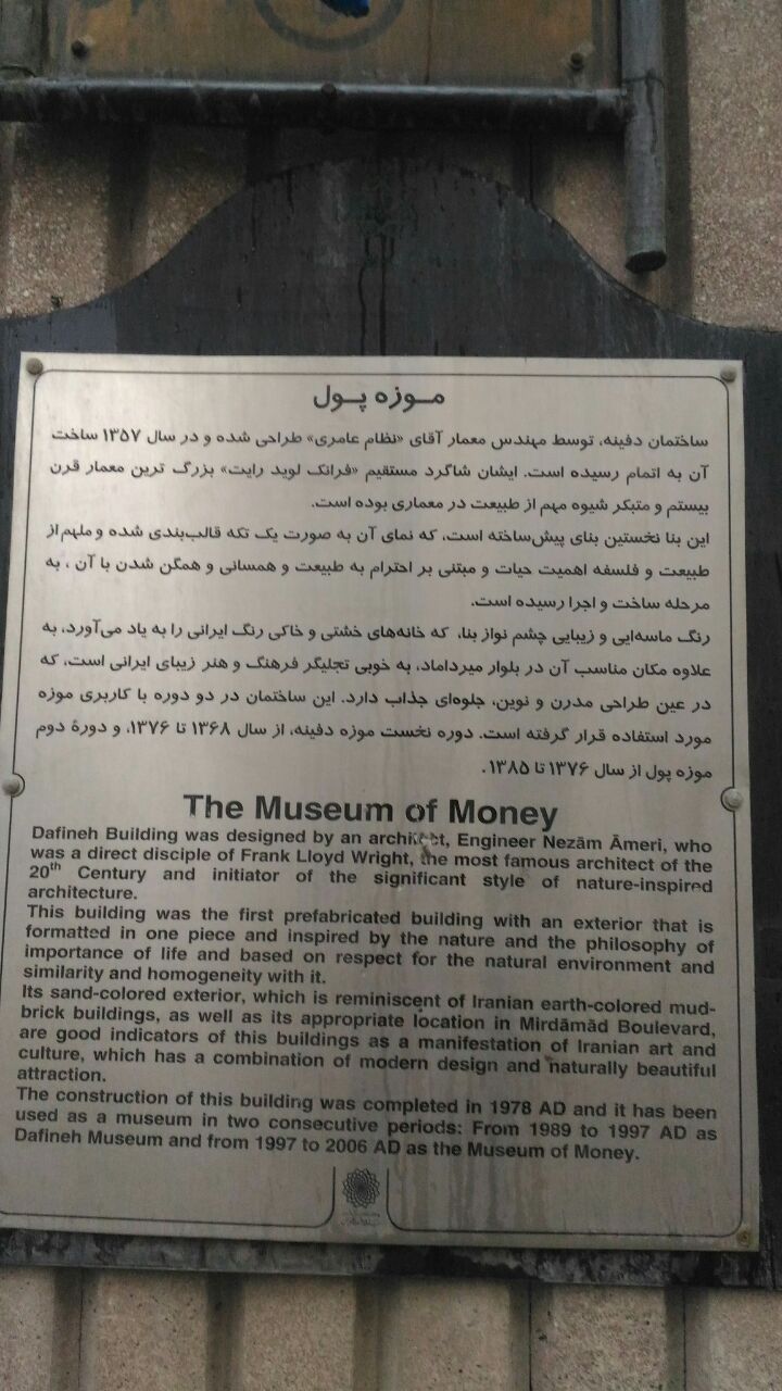 مسوولان موزه‌ی پول یا دفینه (به مالکیت بنیاد مستضعفان)، با استفاده از مشغولیت شهر به مناظره اقدام به تخریب موزه دفینه (پول) کردند. این بنا اثر «کمال کمونه» و «نظام عامری» و تحت نام حقوقی بنیاد فرانک لوید رایت ساخته شده است.