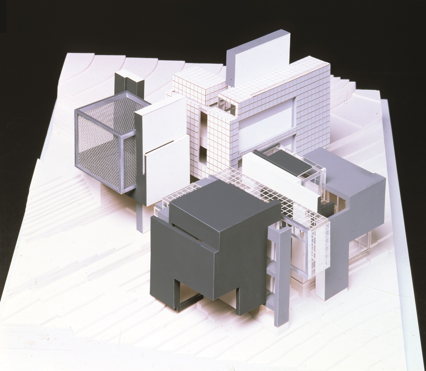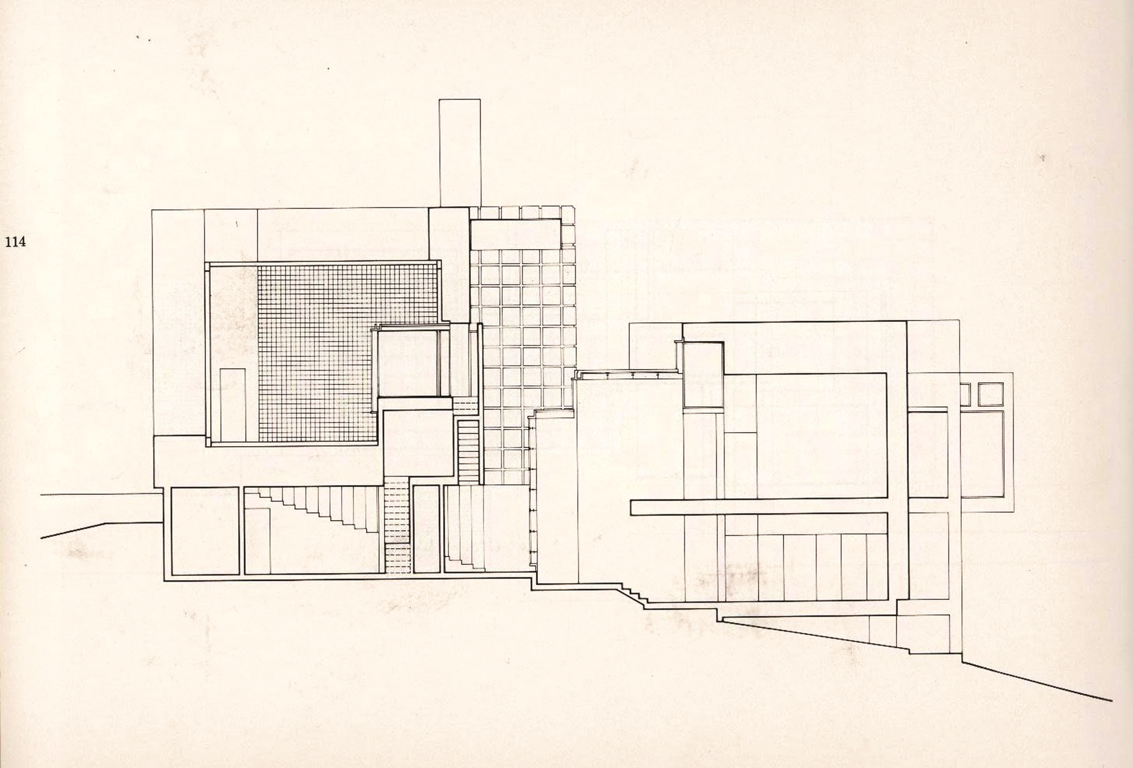 لایهبندی حجمها در نما و با اندکی مکث دوباره به شکل حفرهای کامل ظاهر میشوند و سیستم نگهدارنده و فشار با یکدیگر درگیری و تقابل پیدا میکنند. هنگامی که قاببندی سازهای تکرار میشود، با ایجاد فضایی متقاطع در وسط که از یک طرف بهوسیله پلهها و از طرف دیگر بهوسیله یک فضای باز مانند یک قاب سراسری تا بالا احاطه شده است راهحلی مانند جابهجایی و قرارگیری مدولهای مربع برای بازکردن فضا و گردش و دسترسیهای ارتباطی افقی و عمودی ارائه میکنند.