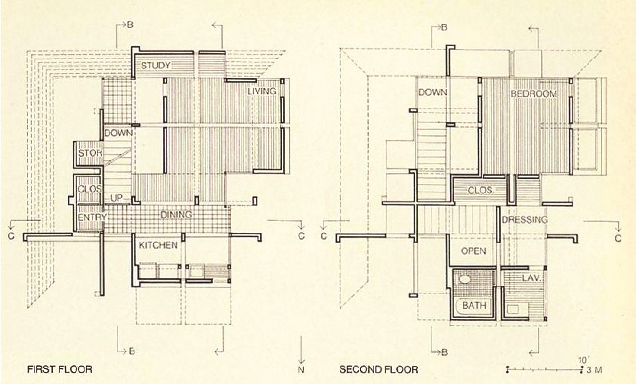 خانه ده در حقیقت فرآیند پراکندگی را در ذات خود دارد. به عنوان مثال؛ فرد با این موضوع در اتاقها روبهرو میشود؛ با کف و سقفی شفاف (شیشه ای) و دیوارهایی بدون پنجره. سطحی که بازشوها بر روی آن پیش و پس میشوند، سطحی است که انتظار میرود از نظر بصری تو پر باشد و با این حال تاثیر این جابهجاییها دو برابر میشود. نکته اول این است که نوعی شوک طبیعی به بیننده القا میشود. او ملزم به تجربه این تناقض بنیادی در یک زبان معماری، بین پهنههای بسته و باز، با جسم مادی خود است.