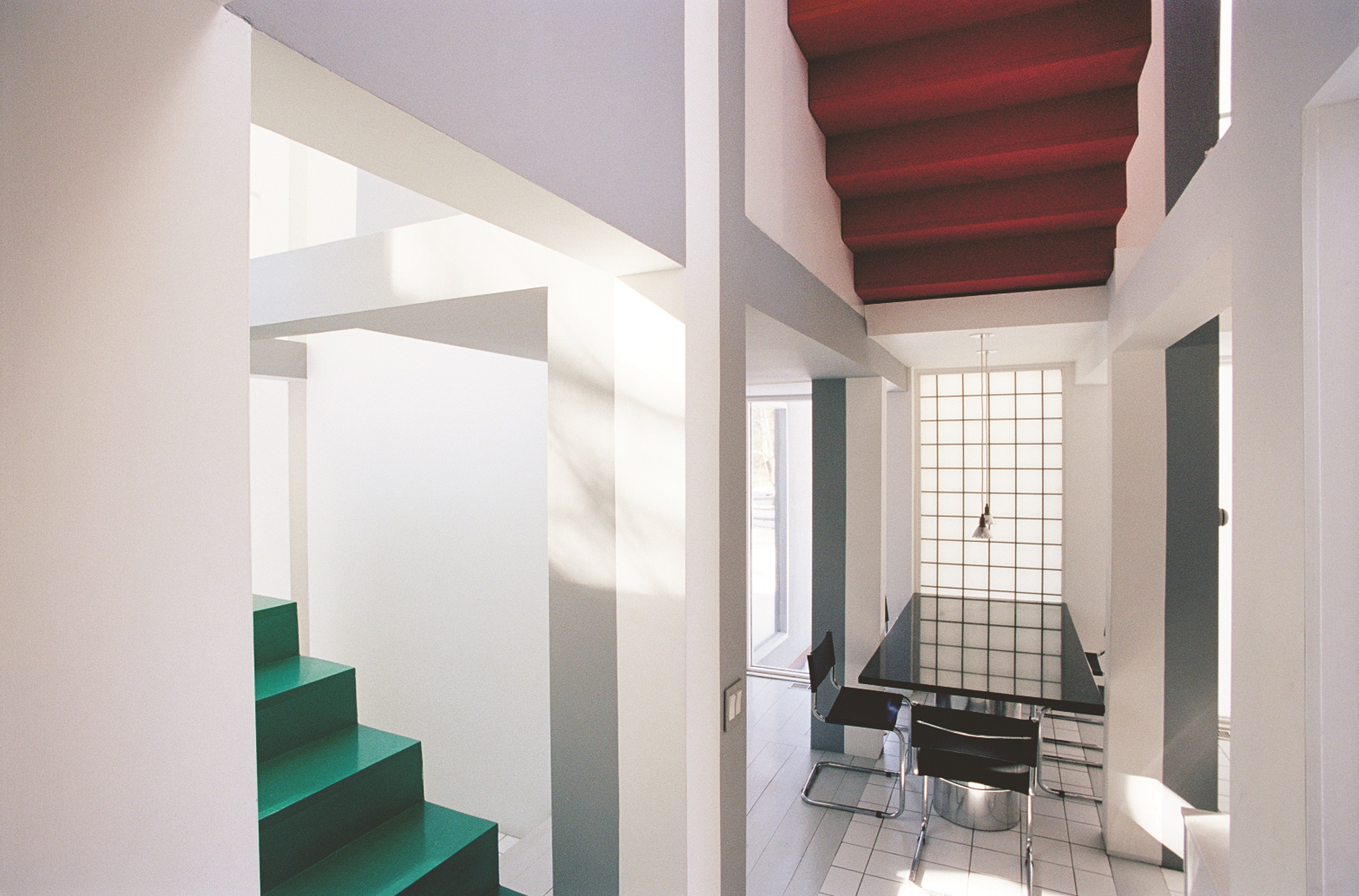 وجه کمیاب دیگر این خانه پلکان بر عکس آن است. عنصری که محورهای این خانه را مجسم میکند و برای جلب توجه با رنگ قرمز، رنگ آمیزی شده است. همچنین جنبههای پیچیده دیگری نیز وجود دارد که زندگی معمولی را مختل میکند، مانند ستونی که بالای میز نهارخوری آویزان است و افراد را در موقع شام خوردن از هم جدا میکند و همچنین حمامی که تنها از طریق یک اتاق خواب قابل دسترسی است.