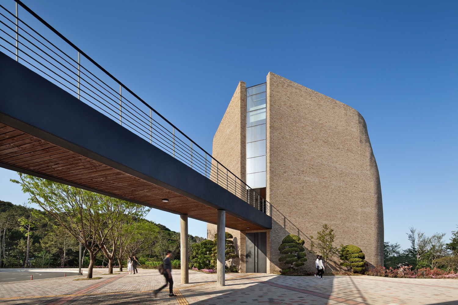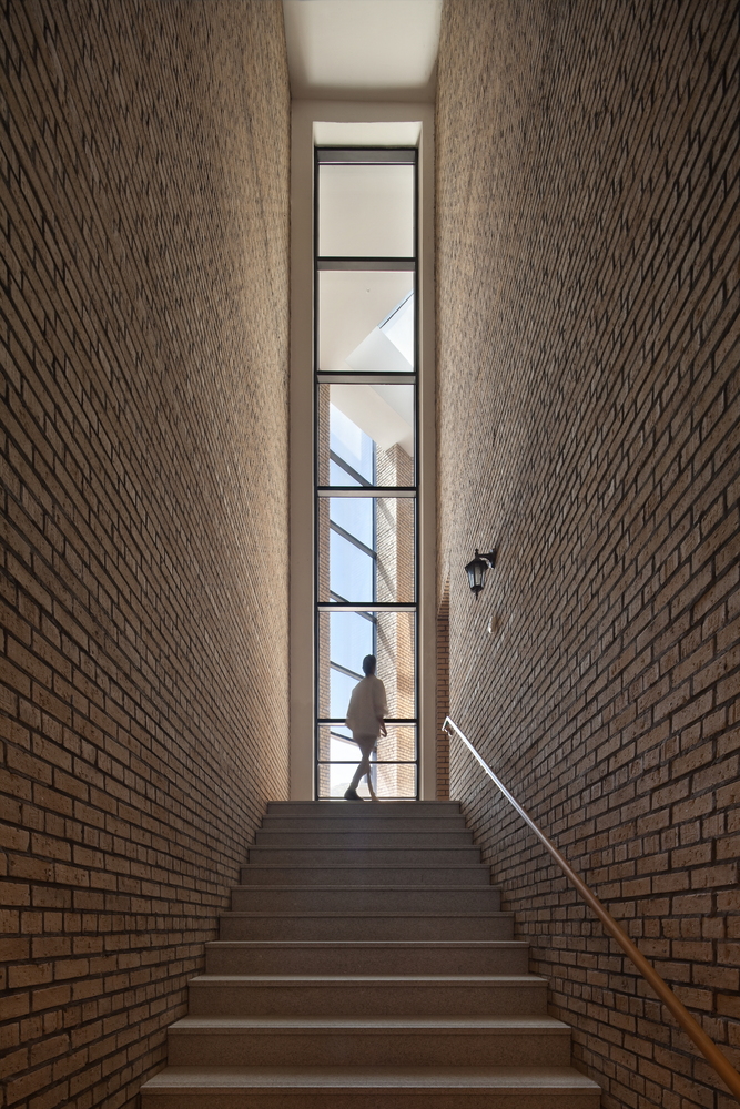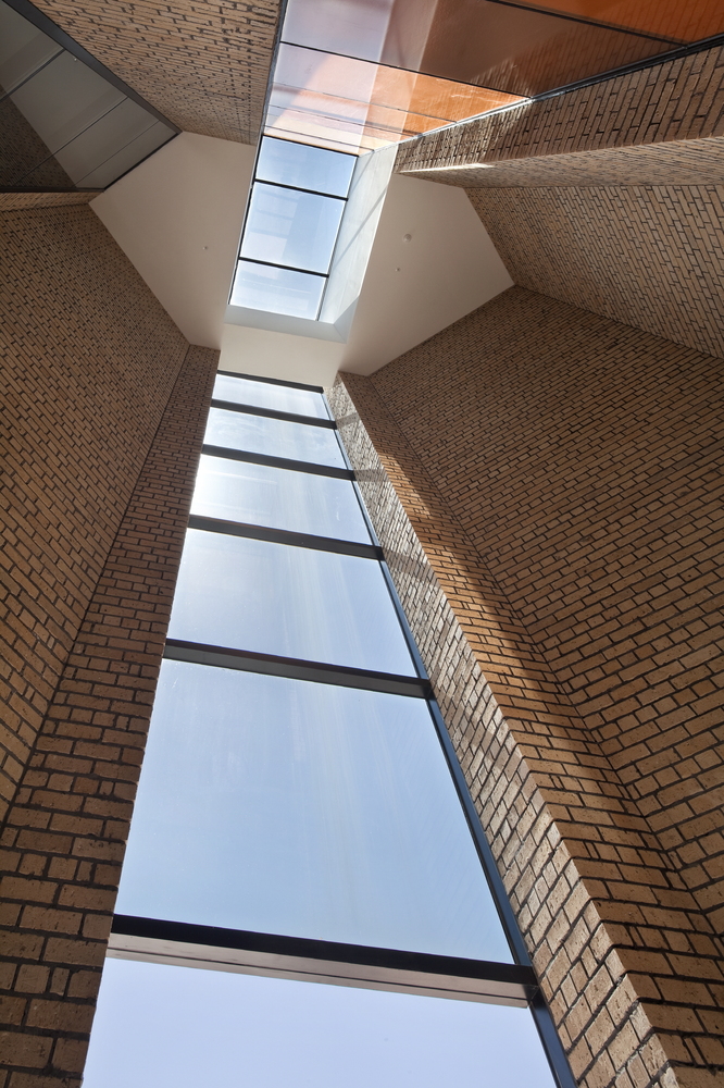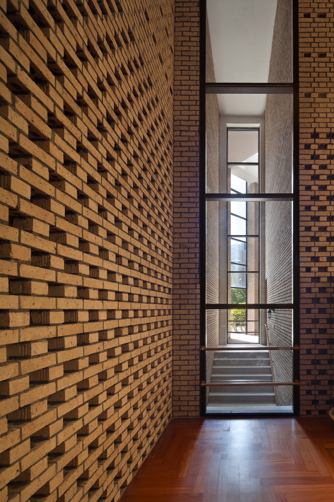 ما ساختار تخت بنا را از پس متریال داخلی و خارجی، برای ساخت فضایی یگانه به کاربستیم. ما تنها مجاز به استفاده از آجرهای بودیم که در کل دانشکده از آن استفادهشده بود و با دیوارهای سفید و ساختمانی که بالای تپه قرار بود جای بگیرد مواجه بودیم. پل و دربی عظیم همگی به یک هدف که ساختمانی یگانه بود کمک میکرد که مسیرهای دسترسی را به کاربران نشان دهد.