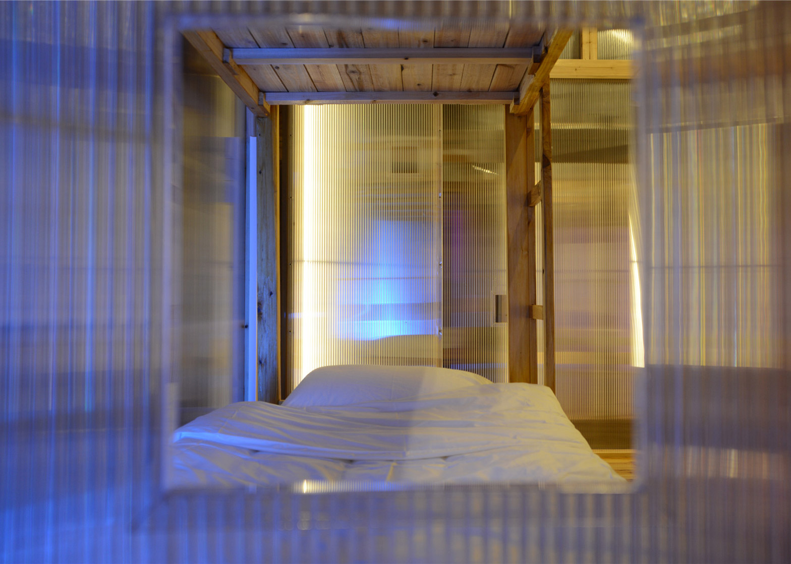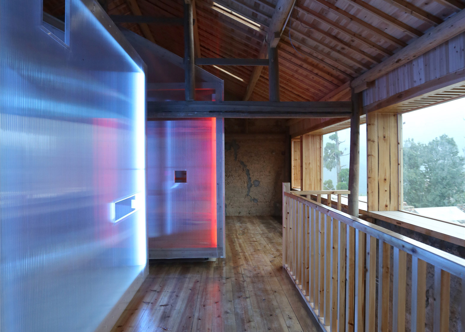 در بازسازی فضای داخلی، اصلاحات بیشتری صورتگرفت. ابتدا، پلان باز طبقهی وسیع فوقانی برای اسکان مهمانان استراحتگاه به بخشهای کوچکتری تقسیمشد. معمار در این پروژه به جای ساخت دیوارهای دائمی, سه « اتاق تودرتو» ارائهکردهاست که قابلیت جابهجایی دارند و در هر کدام از آنها بین چهار تا شش نفر میتوانند روی تختخواب هایچوبیدوطبقه اسکان دادهشوند.