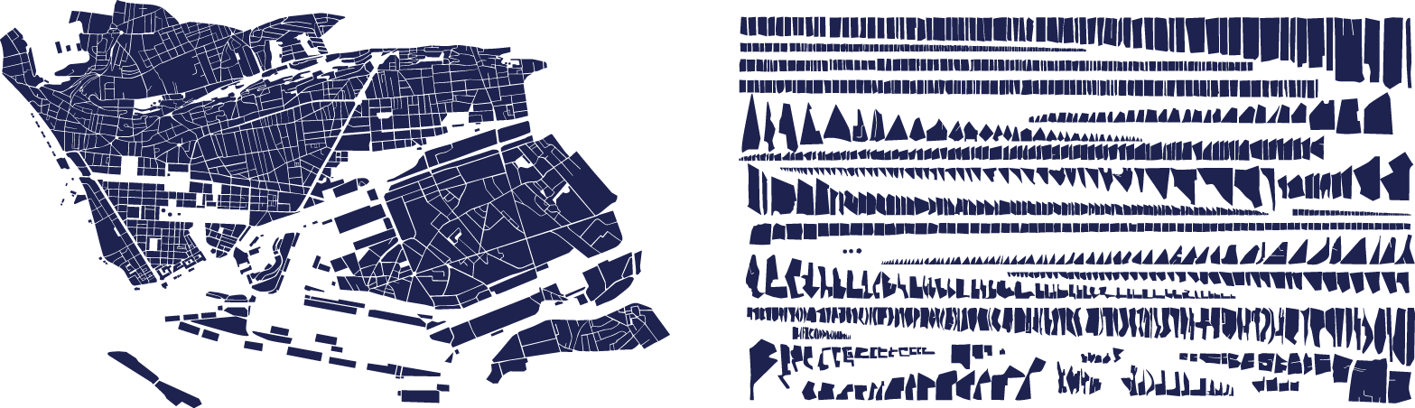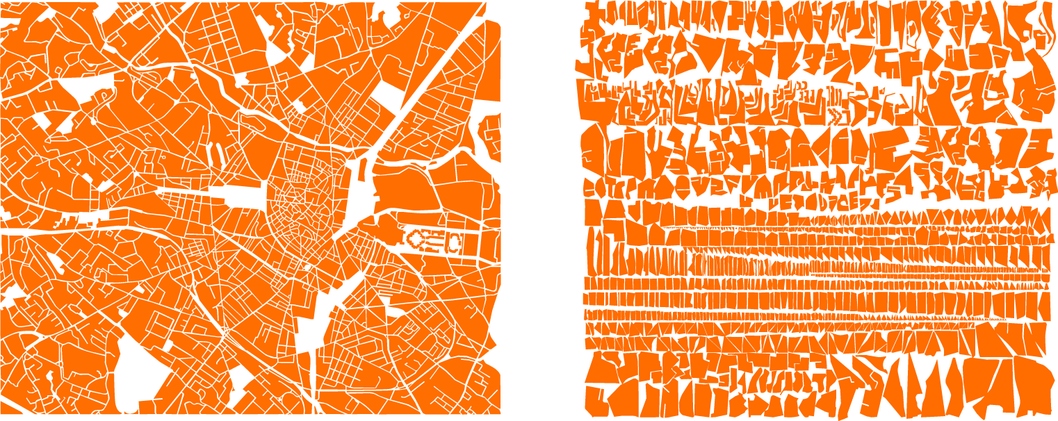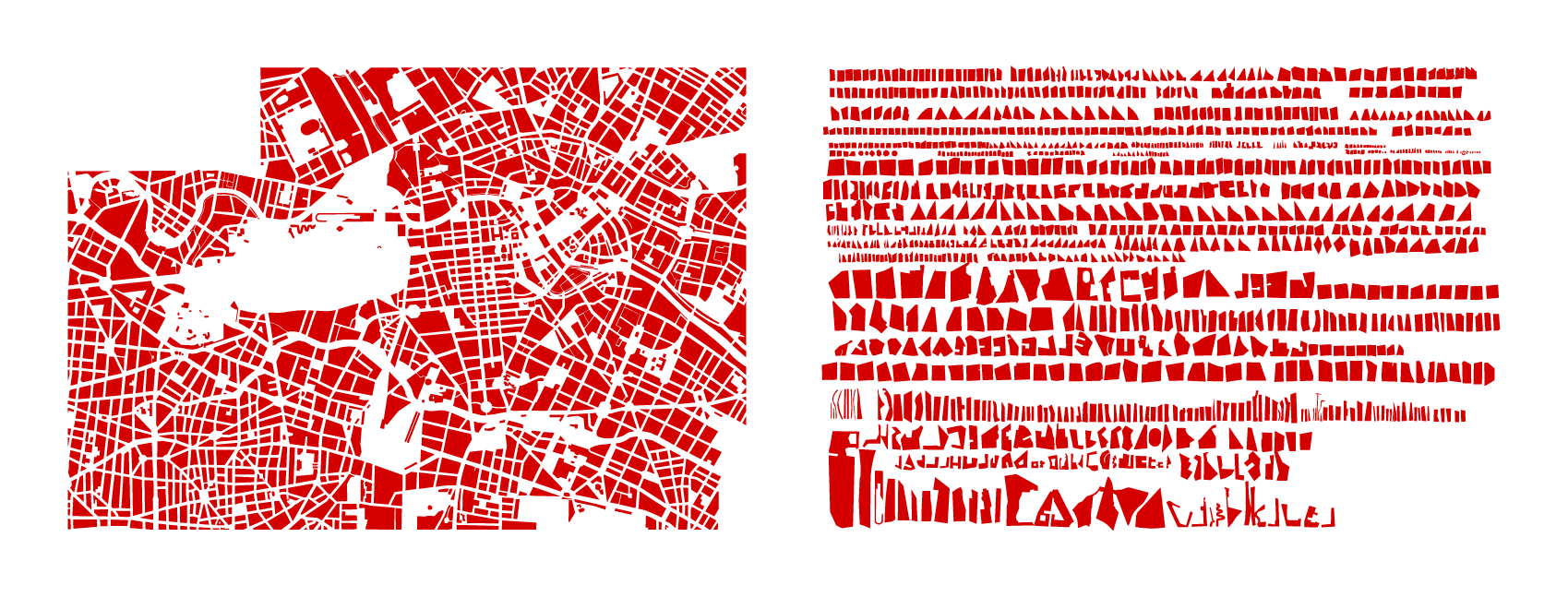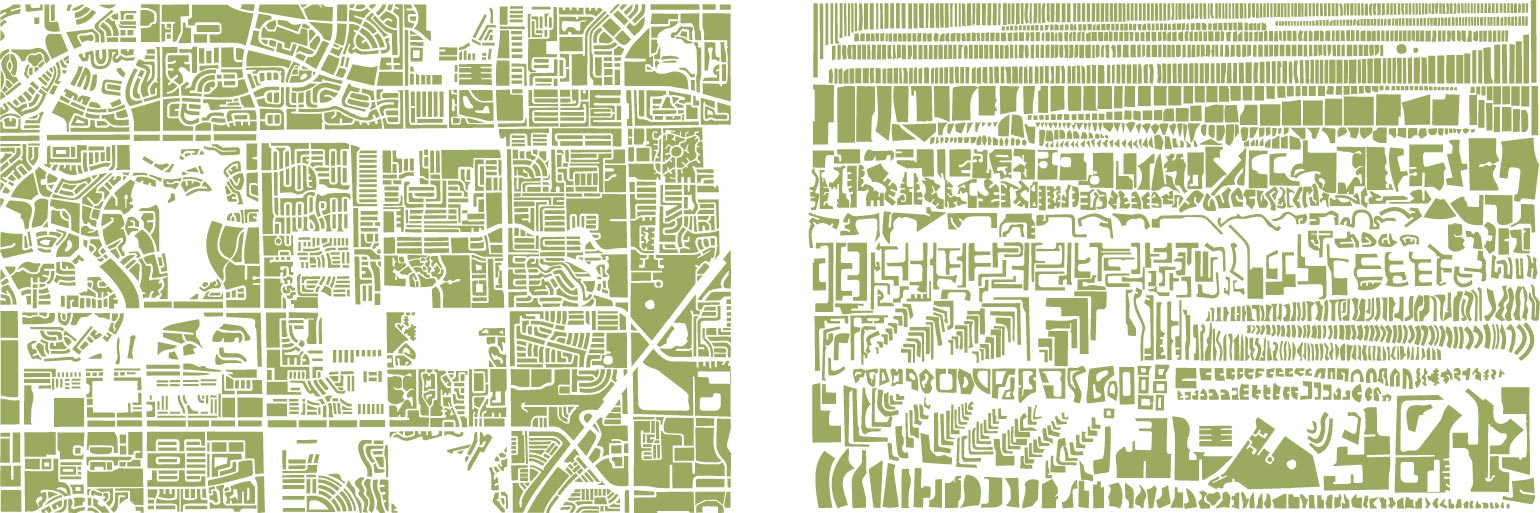 شهرهای مختلف مانند پازلهای قطعهقطعه شده مورفولوژی دفرمه خود را نشان میدهند. علیرغم این دفرمه شدن همچنان میتوان تفاوتهای بسیاری از بافتهای ارگانیک و از پیش طراحیشده را از یکدیگر بازشناخت.