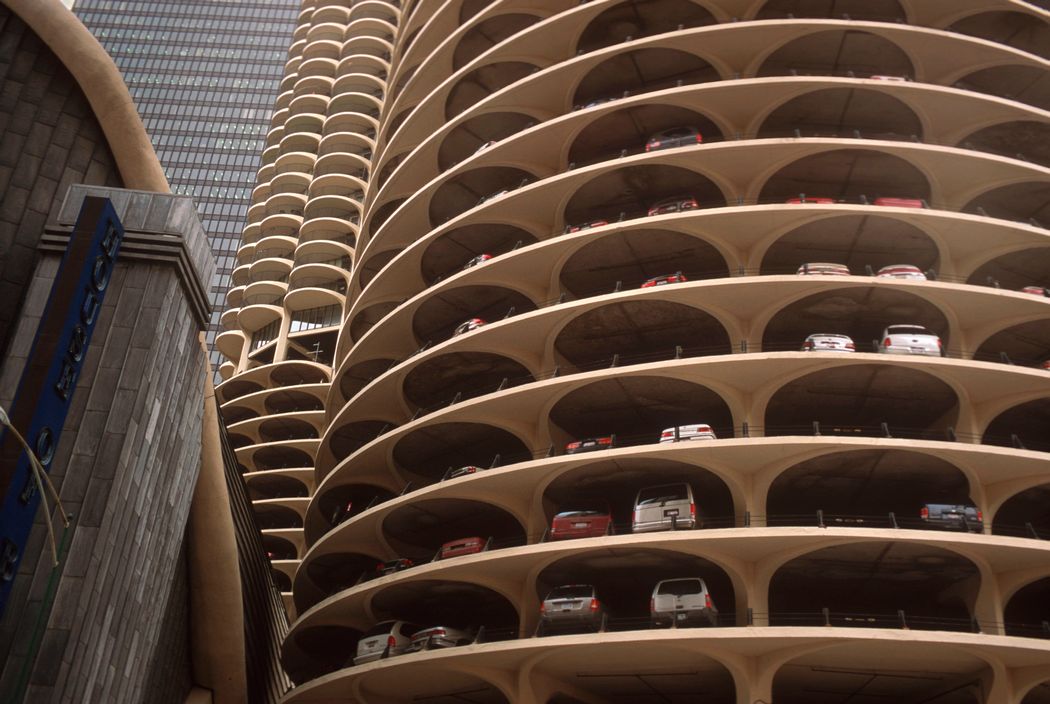 ایالات متحده آمریکا. شیکاگو مارینا سیتی در ساحل غرب رودخانه شیکاگو - 900 آپارتمان در 2 برج. هنگامی که در سال 1967 به اتمام رسید بلندترین برج بتن آرمه در جهان بود. 2003