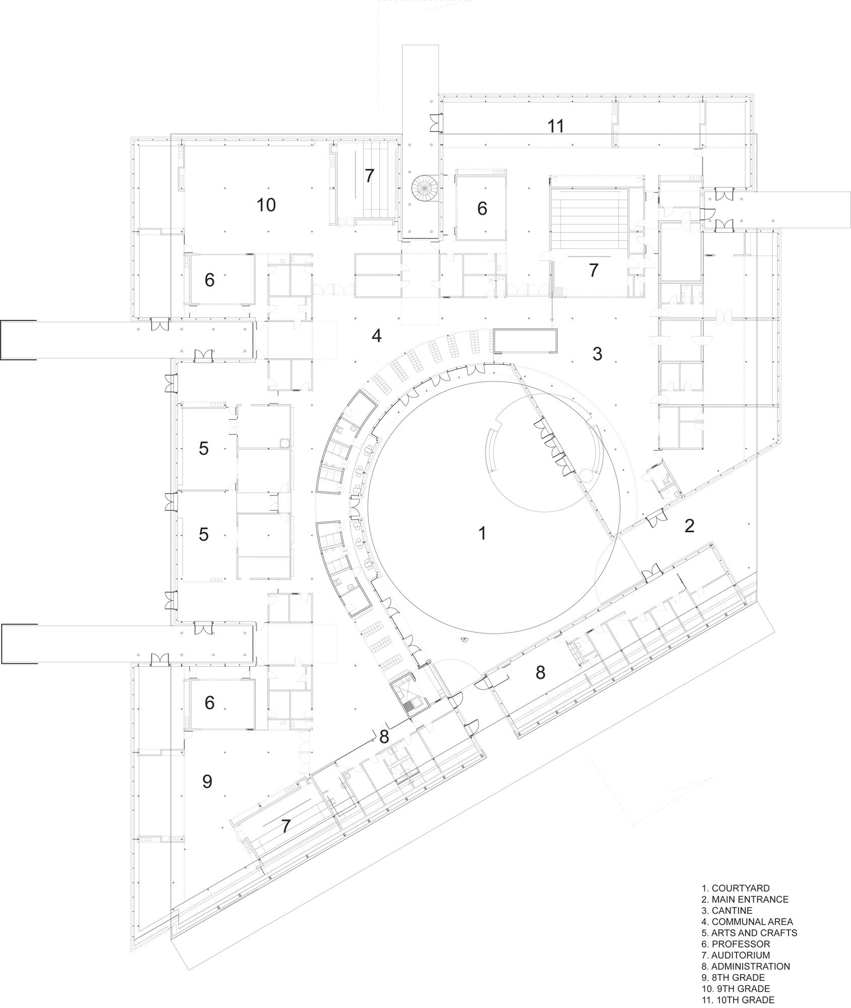 برای هر از دورهی سهسالهی متوسطه، سه مکان مجزا با در نظر گرفتن انعطاف محیطی و استفادهی چندمنظوره از فضاهای مختلف اختصاصیافته است. علاوه بر این، قسمتهای مختلف ساختمان برای ایجاد فضاهای جداگانه در شب قابلیت بسته شدن دارند.