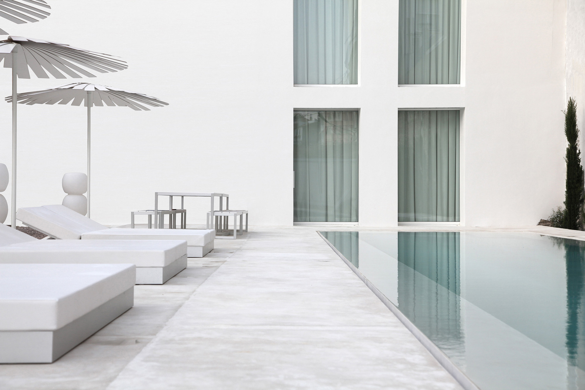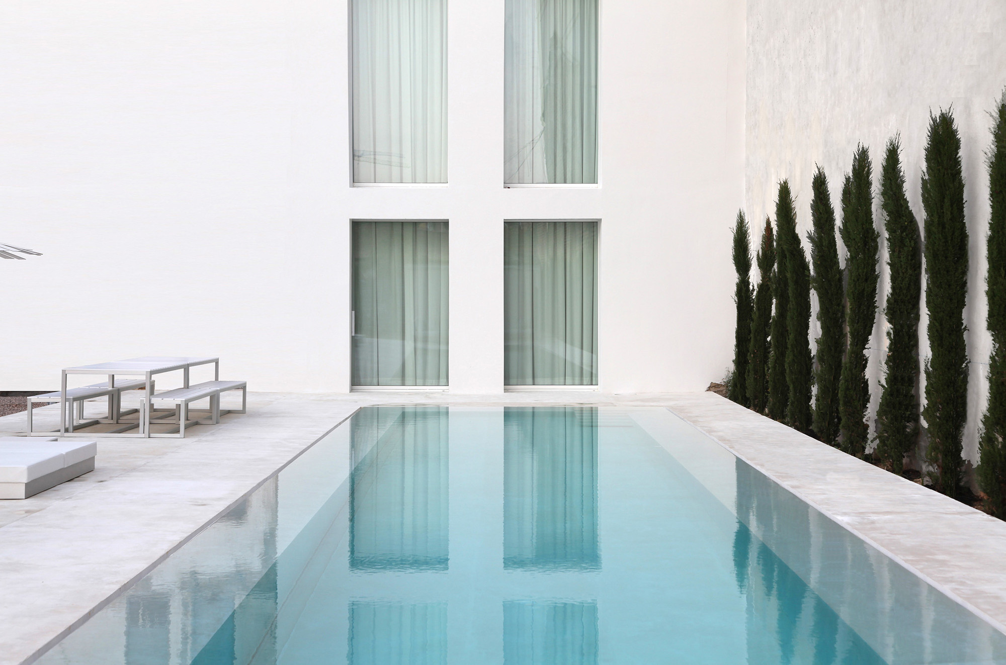 استخر خانه از بتنی سفیدرنگ ساختهشده است و ابعاد آن با نمای پشتی ساختمان هماهنگی دارد.