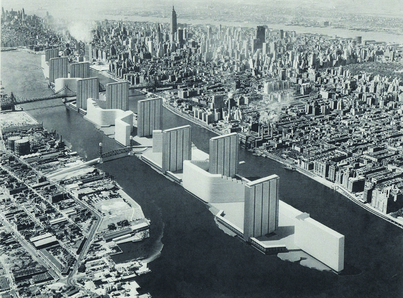 خیالات هود تنها طرحهایی نبودند که برای راههای آبی منهتن پیشنهاد شده ولی ساخته نشده بودند. در ۱۹۴۶ والس هریسون و ویلیام زکندورف[۸] طرح X-city رو پیشنهاد کردند. X-City مجموعهای وسیع است در شرق رودخانه، که در آن آسمانخراشهای منحنیشکل و زیرساختهایی برای فرود آمدن هلیکوپتر و هواپیماهای سبک قرار دارد.