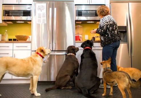 کف آشپزخانه خیلی راحت و سریع تمیز میشود. در اینجا همیشه برای چهار تا هشت سگی که ممکن است آن روز به دفتر آمده باشند، غذا وجود دارد.