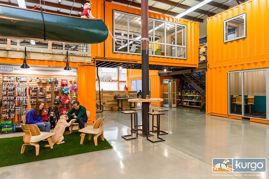 نکتهی بسیار جالب و هیجانانگیزی که در مورد این ساختمان وجود دارد، فرم شکلدهی به فضا و معماری داخلی آن هست. تمام فضاها و المانهای داخلی این بنا به نحوی طراحی شدهاند که برای تردد سگها و بودن آنها در دفتر هم مناسب باشد. چون معمولا هر روز کارمندان این دفتر تعدادی سگ هم همراه خود به محل کارشان میآورند. به عبارت دیگر، در این دفتر که کارمنداناش عاشق حیوانات خانگی هستند، سگها هم کنار انسانها حضور دارند. البته وجود سگها در این دفتر که هدفاش تولید تجهیزات سفر این حیوانات خانگی است، منطقی و حتی ضروری به نظر میرسد.